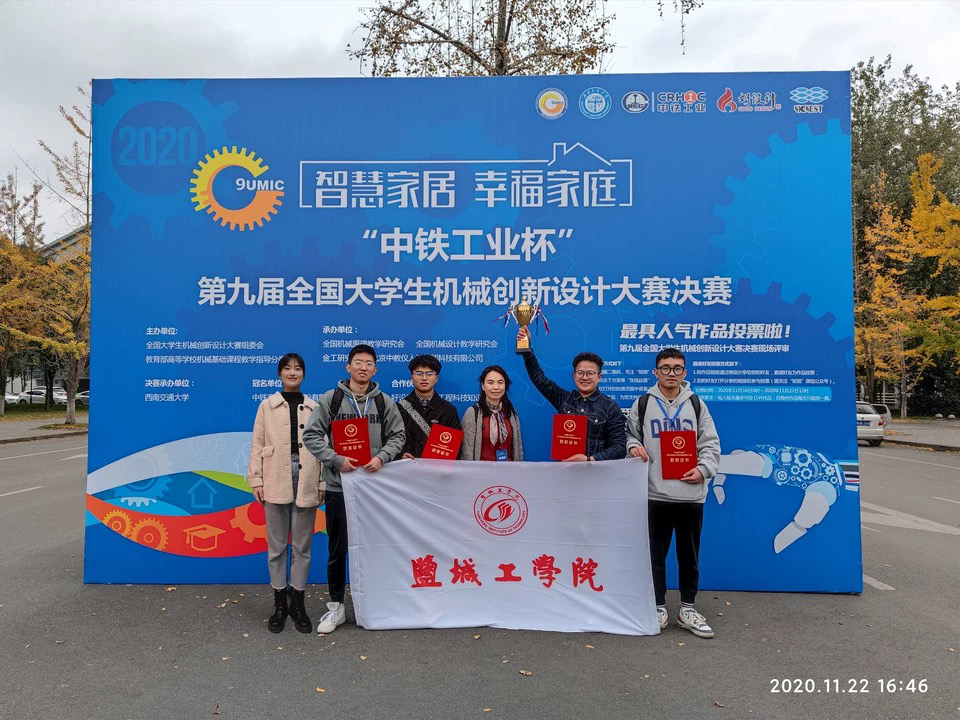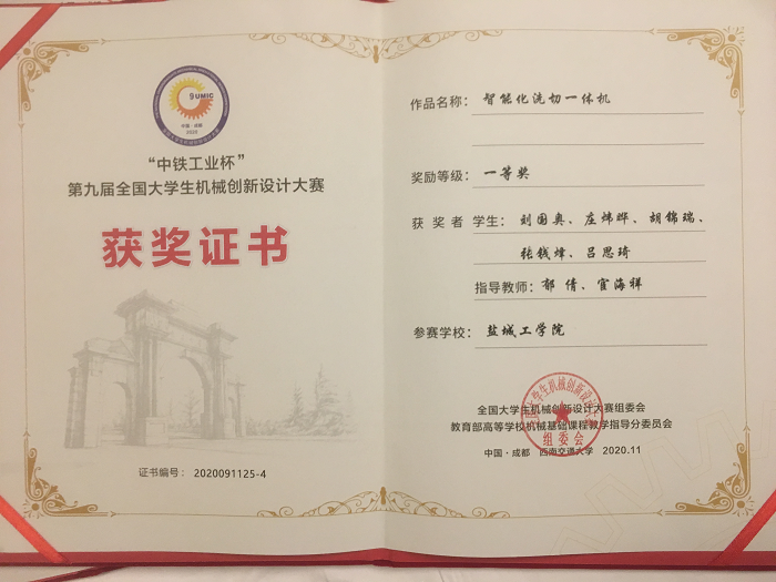 11月22日,在西南交通大学举办的2020“中铁工业杯”第九届全国老员工机械创新设计大赛正式落下帷幕,由williamhill英国官网郁倩、宦海祥老师指导,刘国奥、胡锦瑞、庄玮晔、张钱烽、吕思琦等同学完成的作品“智能化洗切一体机”荣获全国决赛一等奖,这是继郁倩老师取得第八届全国机械创新设计大赛一等奖后再获此殊荣。