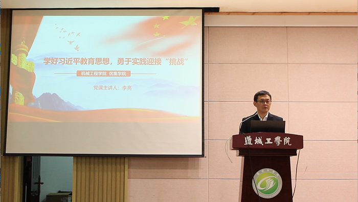 李亮以“学好习近平教育思想,勇于实践迎接‘挑战’”为题,以挑战杯竞赛历程为切入口,以习近平教育思想内容为支撑,穿插习近平讲话精典语录,从锐意创新、迎接挑战,思想引领、信念支撑,扎根需求、特色创新,一分耕耘、一分收获等四个方面进行讲解,将参加“挑战杯”竞赛中各个环节的所见所想与员工分享,深入浅出地谈了他是如何组建团队,在团队思想上遇到困惑问题时,如何用习近平新时代中国特色社会主义思想激励团队成员树立理想信念、勇于创新、善于学习、挑战自我,最终取得成功。他号召同学们要尽早确立自己的理想信念追求,勇于实践,将学业、职业和事业融为一体,挑战自我,做知行合一的实干家。