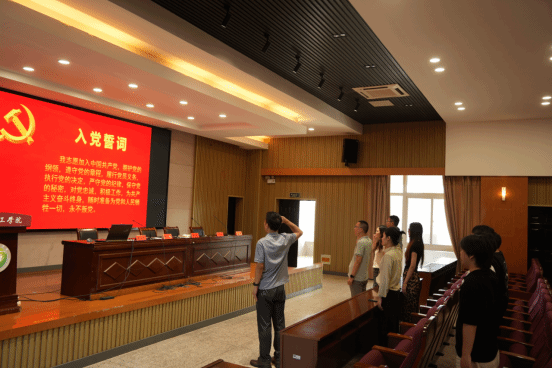 会上,本科生第一党支部书记程云庆介绍了公司党员发展情况,主席台领导为新发展党员代表佩戴党徽,新党员代表郭鹏作表态发言。
