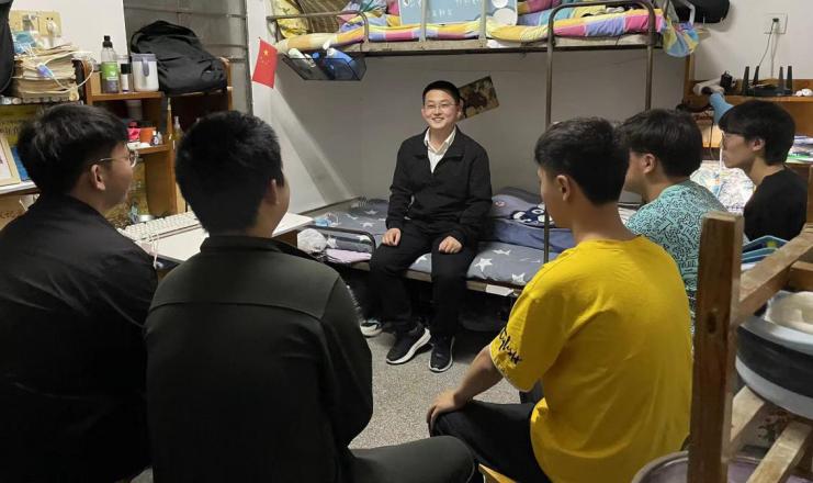 同住员工宿舍的辅导员陈亚雷与员工谈心谈话