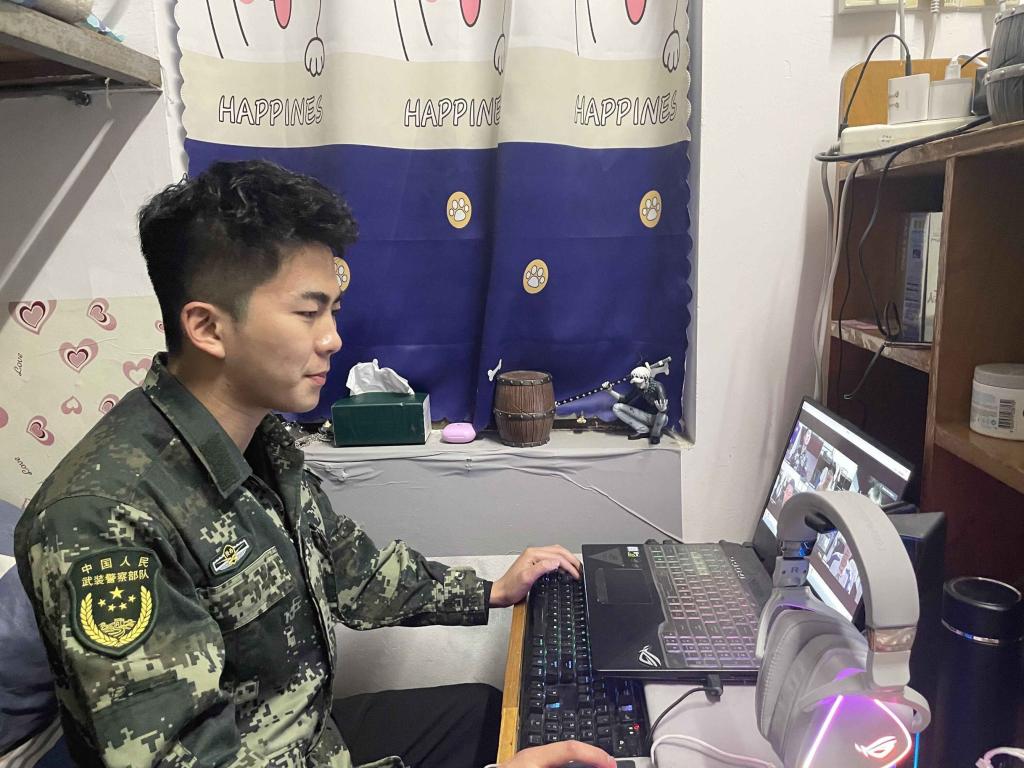 下午三点,在建军东路校区博雅楼,退伍老员工张源同学给大家讲述了他的军营生活,分享不为人知的动人情节。他表示,艰苦的训练带给他钢铁般的意志,严明的纪律让他对生活有了更多的执着。周桂华同学在线上为大家分享了他“一份锤炼,一份收获”的武警生活。同学们为他们的军营生活所动容,纷纷鼓掌。