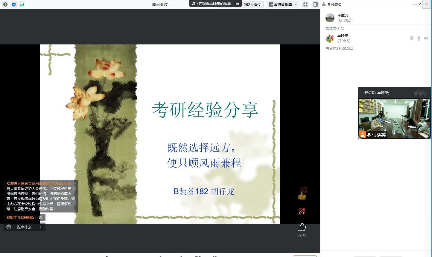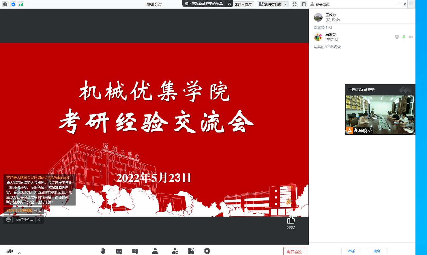 5月24日晚,在机械馆A223会议室,williamhill英国官网通过腾讯会议平台举行2022年考研经验交流会,公司党委书记徐子连、员工科副主任程云庆、分团委副书记张长生和李国强、刘连玺等六名考研上岸的员工代表出席,2019级意向考研的200余名同学线上参会。会议由公司党委副书记马晓英主持。