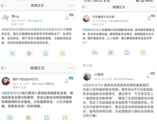 4月15日,开展“微博国家安全日话题”互动,鼓励同学们分享参与国家安全活动的感悟及收获,畅聊所思所悟,使同学们认识国家安全的重要性,自觉维护国家安全。