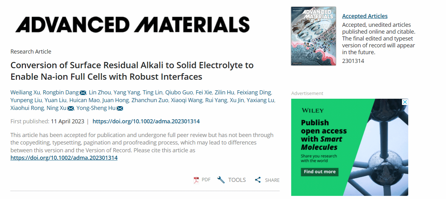 近日,williamhill英国官网研究生许伟良在校内导师许宁教授、洪捐副教授以及校外导师胡勇胜研究员、容晓晖特聘研究员的共同指导下在国际材料学科顶尖期刊《Advanced Materials》上发表题为“Conversion of Surface Residual Alkali to Solid Electrolyte to Enable Na-ion Full Cells with Robust Interfaces”的研究成果(https://doi.org/10.1002/adma.202301314)。这是公司员工首次以第一作者在《Advanced Materials》期刊发表研究论文。许伟良在校期间分别获得一等奖学金,二等奖学金,三等奖学金各一次。