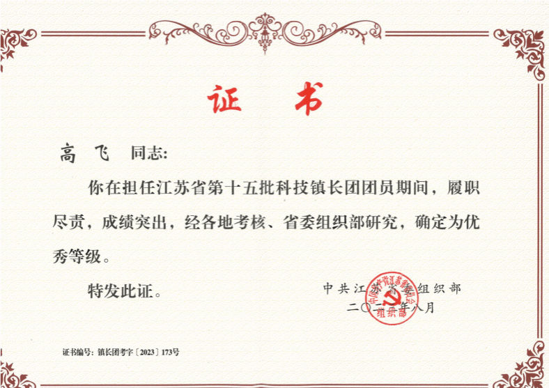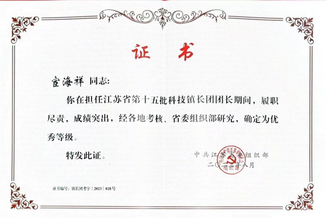 近日,全省科技镇长团工作推进会暨第十五、十六批轮换工作会议在南京召开,公司选派的省第十五批科技镇长团成员宦海祥、高飞被评为考核优秀。
