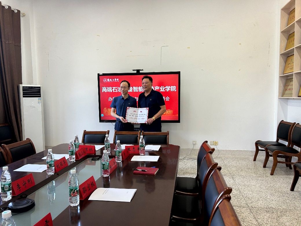 会上,周临震为韩正海颁发产业教授聘书,刘军向与会代表汇报了产业公司暑期校外实践方案。刘德仿从办学目标、专业人才培养定位、专业培养目标与要求等方面介绍了产业公司的人才培养方案,通过“两个阶段,三个环节,两类教学”,为石油机械行业培养企业所需的工程应用型人才。