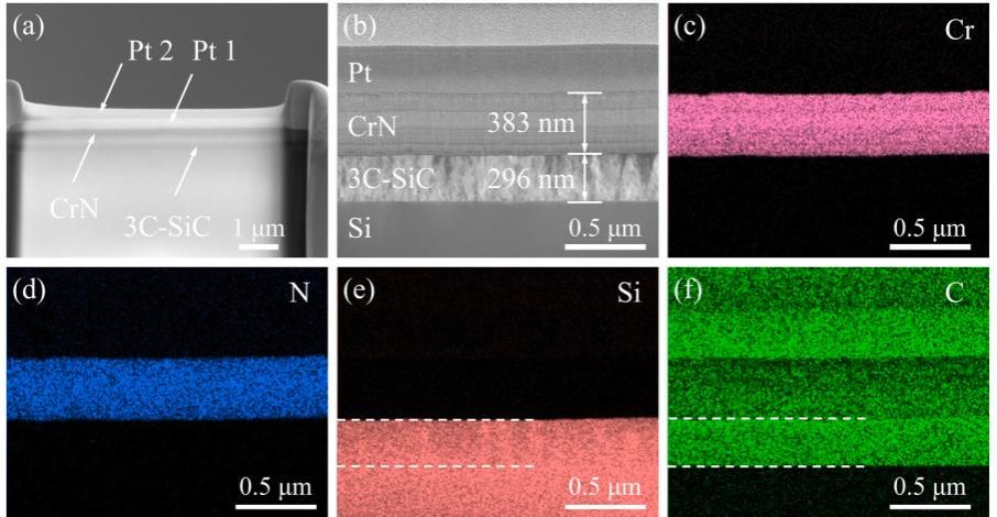 Fig. 1. (a) FIB treatment of CrN-3C-SiC thin film, (b) Low-resolution cross-sectional TEM image of the CrN/3C-SiC thin film, EDS element mappings of thin film: (c) Cr, (d) N, (e) Si, and (f) C.