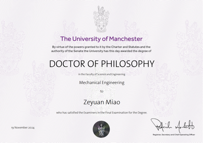 2015级员工缪泽源于2024年曼彻斯特大学博士毕业,现曼彻斯特大学博士后